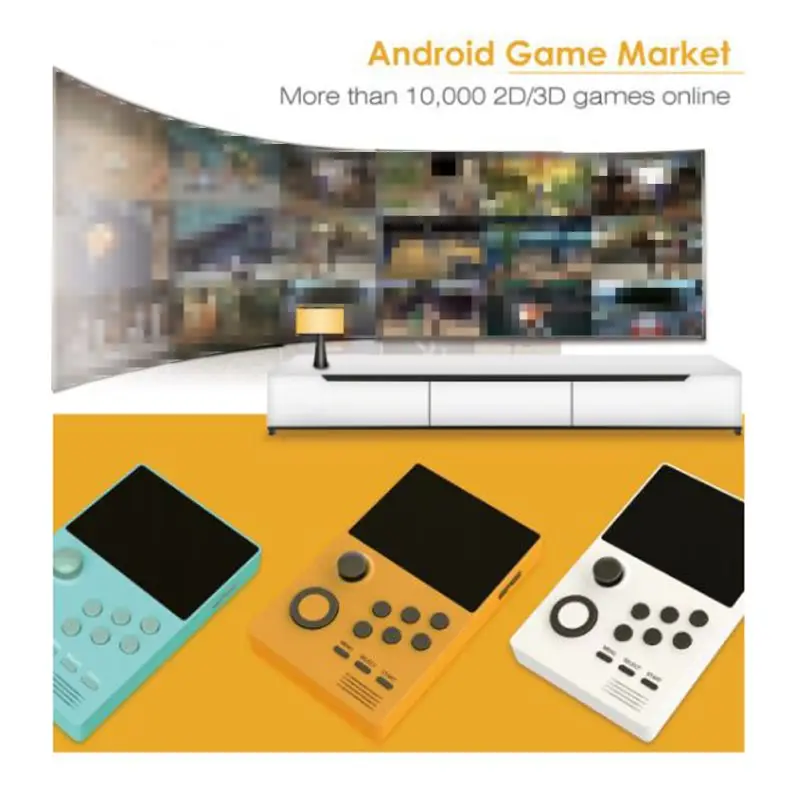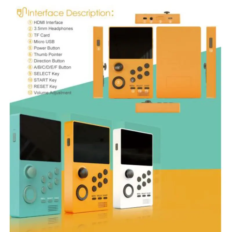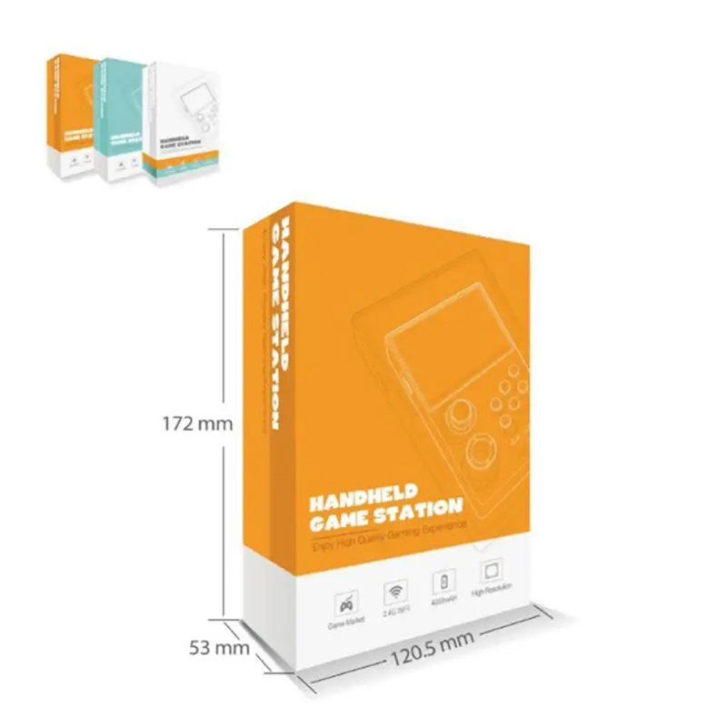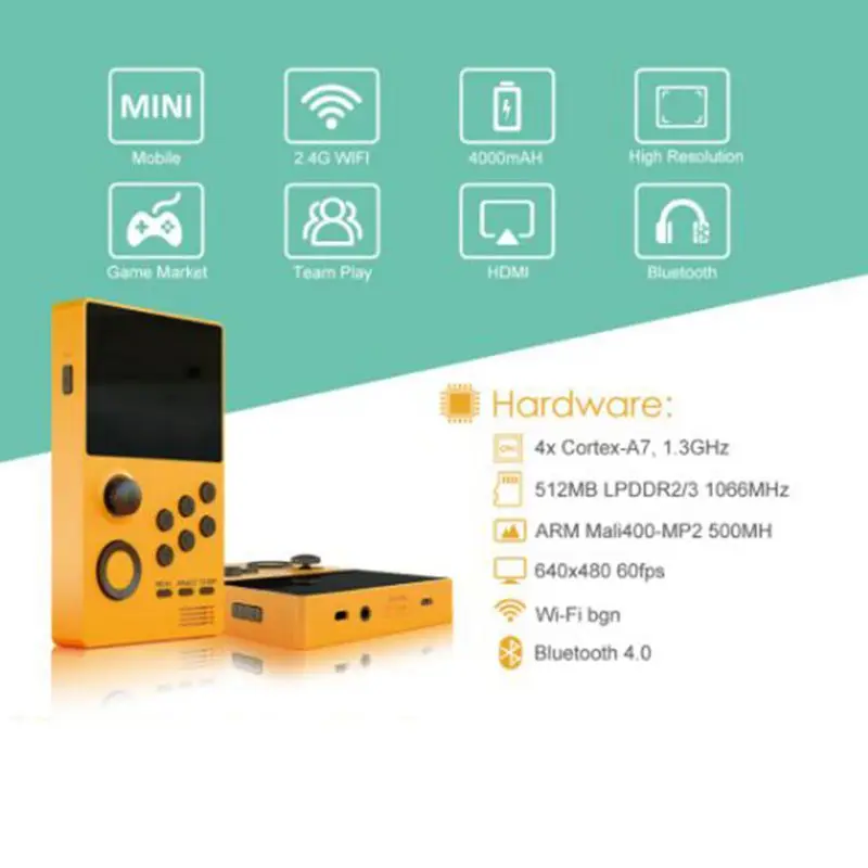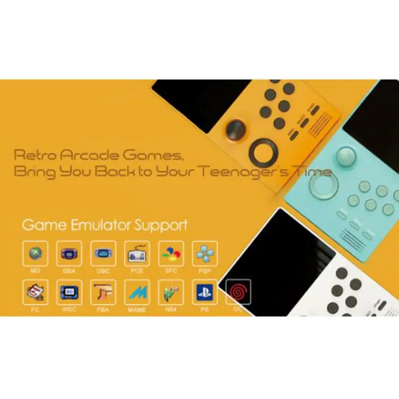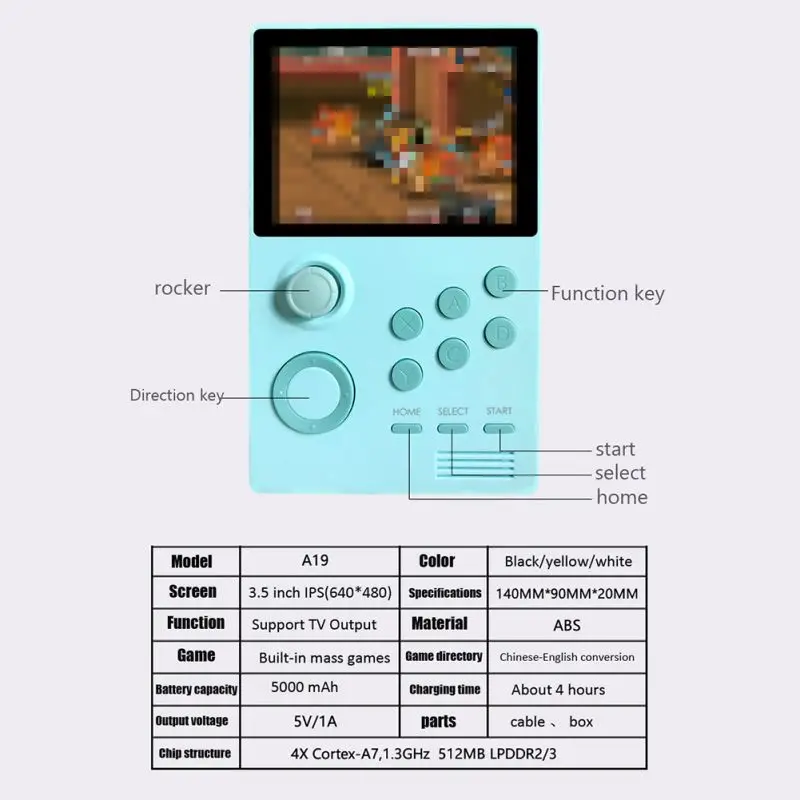 Model: A19 Color :Black/yellow/white Screen :3.5 inch IPS(640*480) Specifications: 140MM*90MM*20MM Function: Support TV Output Material: ABS Game: Built-in mass games Game directory: Chinese-English conversion Battery capacity: 5000 mAh Charging time: About 4 hours Output voltage: 5V/1A parts: cable 、 box Chip structure :4X Cortex-A7,1.3GHz 512MB LPDDR2/3
