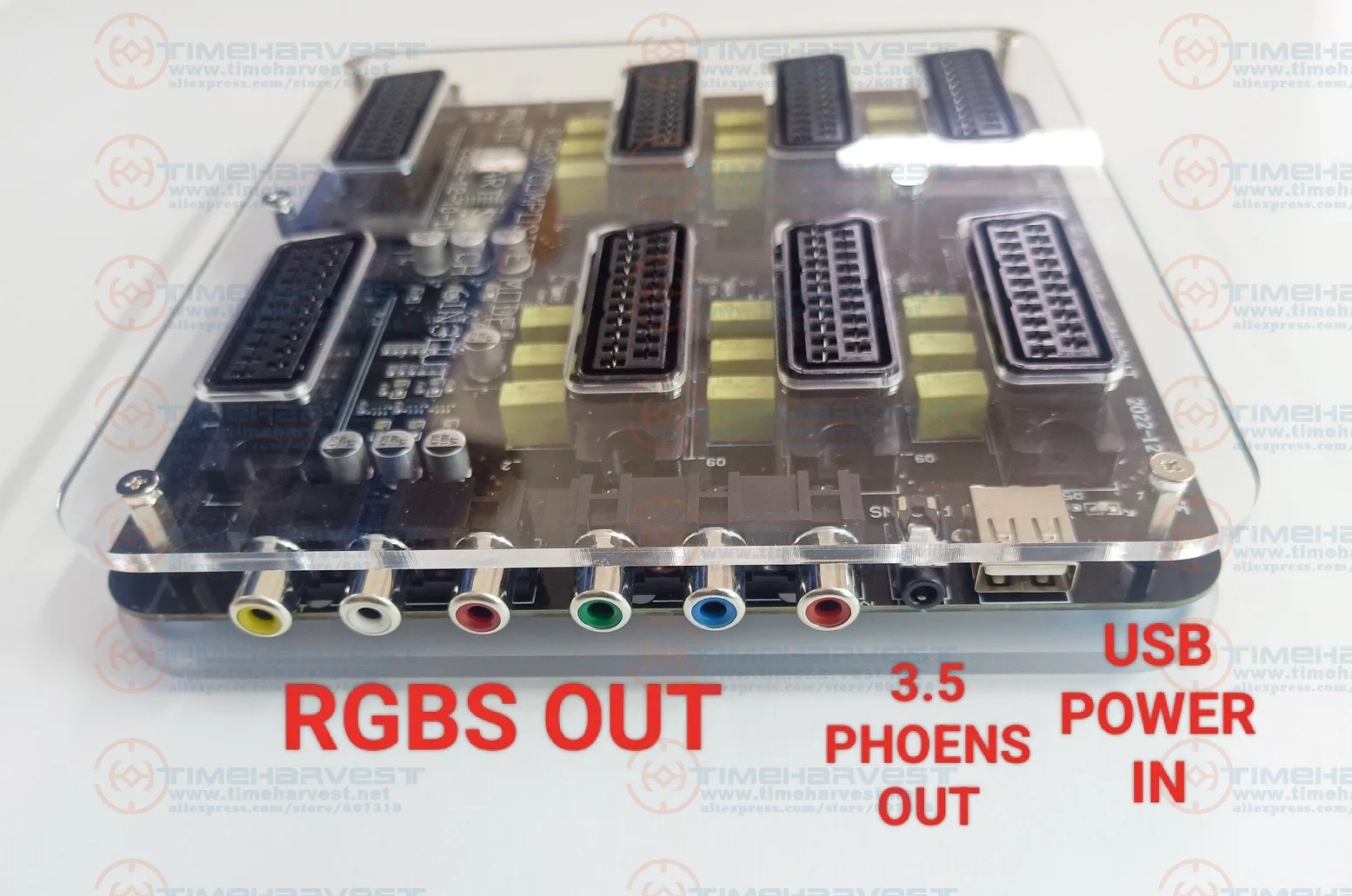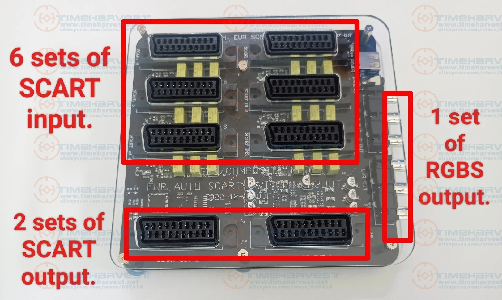 1. It can input 6 sets of EUR SCART devices at the same time, 2 sets of EUR SCART outputs and 1 set of RGBS outputs (RGBS is generally connected to a monitor with RGBS input, and the monitor needs to be connected with a BNC to RCA connector, which cannot be used by ordinary TV), and 3.5 audio outputs are provided with headphone holes.
